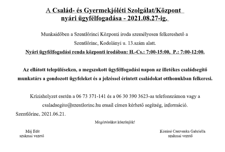 Családsegítő nyári ügyfélfogadása és ügyfélfogadás szünetel