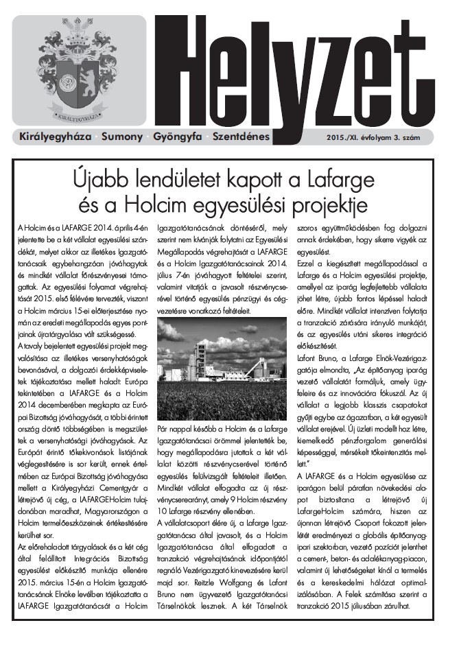 Helyi önkormányzatok, intézmények, lakosok bevonásával alakított ki biciklis pihenőt a LAFARGE Cement Magyarország Kft., a cementgyár és a két érintett település önkormányzatainak támogatásával tavaly megépült Királyegyháza-Szentlőrinc kerékpárút mellett.